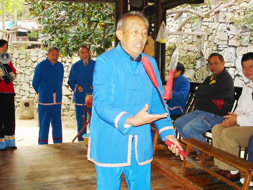三棒鼓,唐代稱三仗鼓,約于明代傳入張家界,并逐漸成為群眾喜聞樂見的民間藝術(shù)形式。每年春節(jié),藝人們結(jié)伴走村串寨拜年,表現(xiàn)對象不分貧富,戶戶必到。如遇貧寒之家,表演者將別家贈送的禮品相送,意在人人過節(jié)歡喜。充分體現(xiàn)出土家人熱情好客,心地善良的民族性格。對加強民族間團結(jié)有一定的作用。三棒鼓 通常由三至五人組成,一人擊鼓唱詞,一人鑼鼓配樂,一人;ò。花棒三根,長一尺,舞者左右 各執(zhí)一根,將另一根拋在空中,左右開弓,擊打空中花棒使之不落地。也有以刀代棒,以五刀代三棒的技藝。鋼刀在空中歡跳,銀光閃閃,左右穿梭。技藝高強者,突然把刀拋得及高,來一個騰空飛腳,轉(zhuǎn)身外擺,繼續(xù)接刀上拋,令人眼花繚亂,不禁稱絕。打三棒鼓,通常有“鬧春耕”、“收割打場”、“慶豐收”、“拜年節(jié)”四套,分“鯉魚跳龍門”、“玉女穿梭”、“板巖漂灘”等項目。打三棒鼓技巧性強,表演時需高度集中,用力適當,貫通一氣,并與演唱者默契配合。