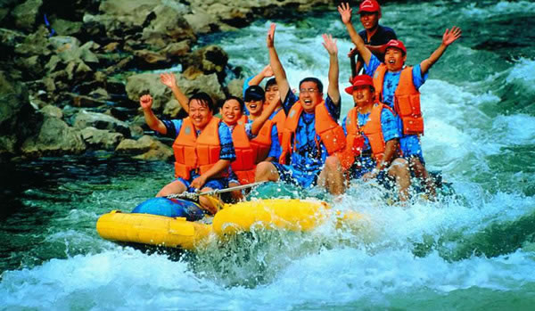 將離開王村之際,導游說猛洞河就在王村附近,不如去漂流一番。這個提議得到了大家的熱烈擁護:早就聽說過猛洞河“天下第一漂”的美名,怎么可以迎面錯過?于是揮師猛洞河,不過因為是臨時決定,時間上比較緊張,我們必須在兩個小時內(nèi)完成漂流——據(jù)說這是項不可能完成的任務(wù)。