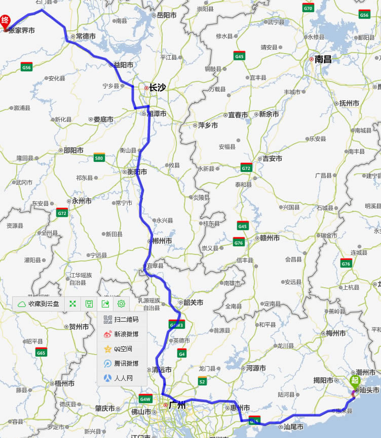 汕頭去張家界自駕車自助游線路圖全程高速):