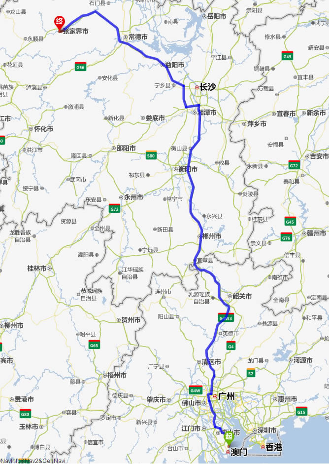 珠海去張家界自駕車自助游線路圖全程高速):