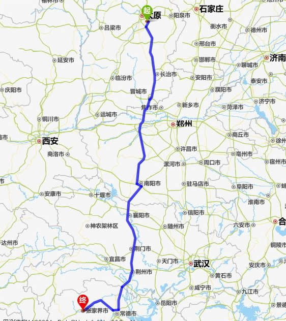 左右,沿途經過晉中——長治——焦作——南陽——襄陽——荊門——荊州——常德(也可以走國道經澧縣、石門縣)——慈利——張家界。